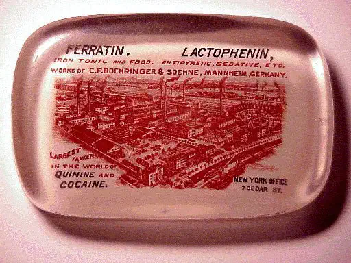 Pisapapeles de propaganda de la casa alemana C.F. BOEHRINGER & SOEHNE en el que puede leerse: “LARGEST MAKERS IN THE WORLD OF QUININE AND COCAINE”. La potente industria químico-farmacéutica alemana, establecida en Mannheim, se ufanaba de ser la mayor fabricante del mundo de ambos productos a finales del siglo XIX y principios del XX.