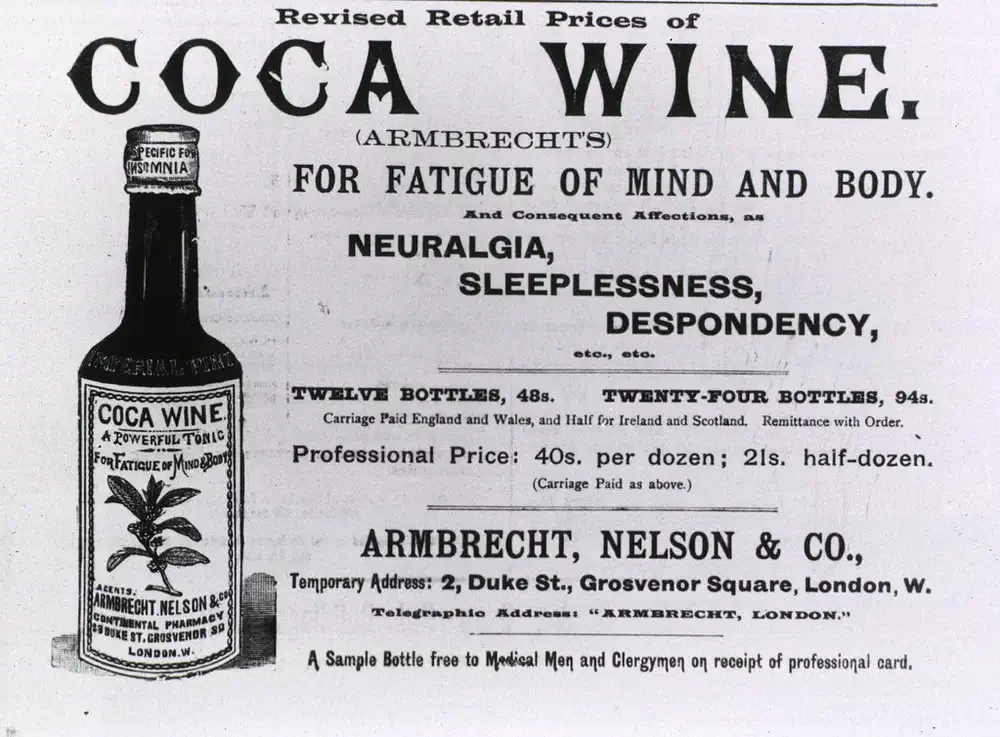 El COCA WINE de METCALF, fabricado en Boston con “hojas frescas de coca y vino puro” por THEODORE METCALF & CO., también se recomendaba para la “neuralgia, insomnio, desaliento”.