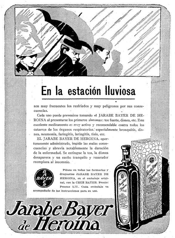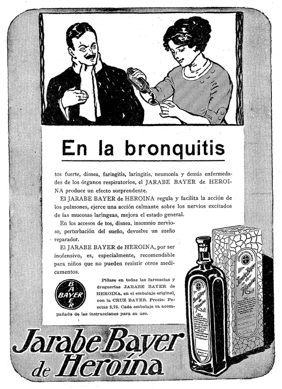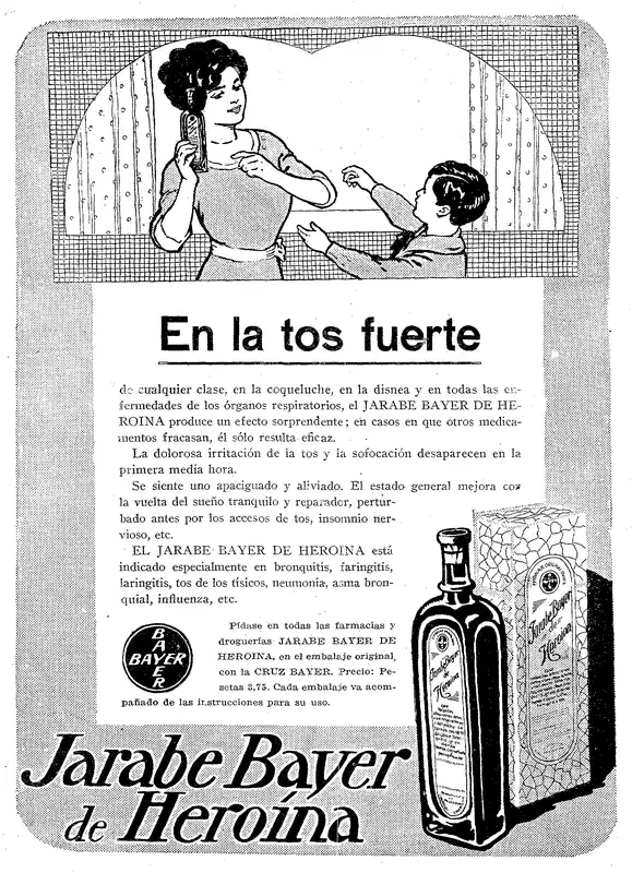 Durante la temporada de invierno y primavera del año 1912 la casa Bayer costeó una sugerente campaña de prensa en España haciendo publicidad de su jarabe de heroína. A destacar el marco cotidiano, con escenas domésticas, empleado para ilustrar la campaña.