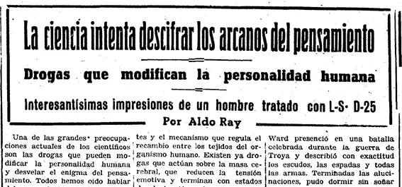 Aldo Ray comenzaba su exposición lamentando el retraso de la psiquiatría, la neurología y la psicología con respecto a los avances experimentados por la física nuclear, al tiempo que reconocía las dificultades a las que se enfrentaba la ciencia para revelar los secretos del cerebro. No obstante, deslumbrado por los últimos logros de la farmacología —difusión de la clorpromazina en 1952 y descripción de las propiedades de la reserpina al año siguiente— y de la bioquímica —descubrimientos relacionados con la enteramina y la serotonina entre 1938 y 1953—, destacaba el interés existente dentro de la comunidad científica por las drogas capaces de “modificar la personalidad humana y desvelar el enigma del pensamiento”. En este sentido, el periodista informaba a los lectores de la existencia de “drogas que actúan sobre la masa cerebral, que reducen la tensión emotiva y terminan con estados de alucinación o de agitación, logrando importantes modificaciones”, y de otras sustancias psicoactivas que obran justo a la inversa: “originan perturbaciones, las cuales, una vez estudiadas, se curan a su vez”.