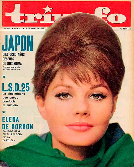 Al igual que sucedió en EE. UU. y en el resto de países occidentales, su irrupción masiva en la calle estuvo precedida en España por lo que bien podría parecer una agresiva campaña de promoción orquestada en torno a un producto nuevo y fascinante, aunque no exento de peligros. Casi con toda seguridad, las primeras noticias sobre ese salto en la accesibilidad de la sustancia que se estaba produciendo en EE. UU. llegaron a España a través de un artículo publicado en el semanario de información general Triunfo, que en plena dictadura franquista pugnaba por ejercer un periodismo insobornable, de inequívoco talante progresista, en un esfuerzo encomiable por dirigirse a un público cada vez más amplio, transitando senderos culturales prácticamente vedados y permitiendo que sus páginas pudieran acoger las grandes corrientes del pensamiento occidental. Efectivamente, el 4 de enero de 1964 la revista Triunfo publicó un extenso reportaje de Robert P. Goldman titulado “LSD, un poderoso alucinógeno que puede conducir al suicidio”. El bello y sugestivo rostro de la modelo publicitaria estadounidense Kecia Nyman ocupaba por entero la fotografía de la portada, pero dicho artículo se destacaba en grandes titulares junto con otros dos reportajes: uno sobre Japón, dieciocho años después del lanzamiento de la bomba de Hiroshima, y otro sobre el bautizo de la infanta Elena de Borbón en el Palacio de la Zarzuela.